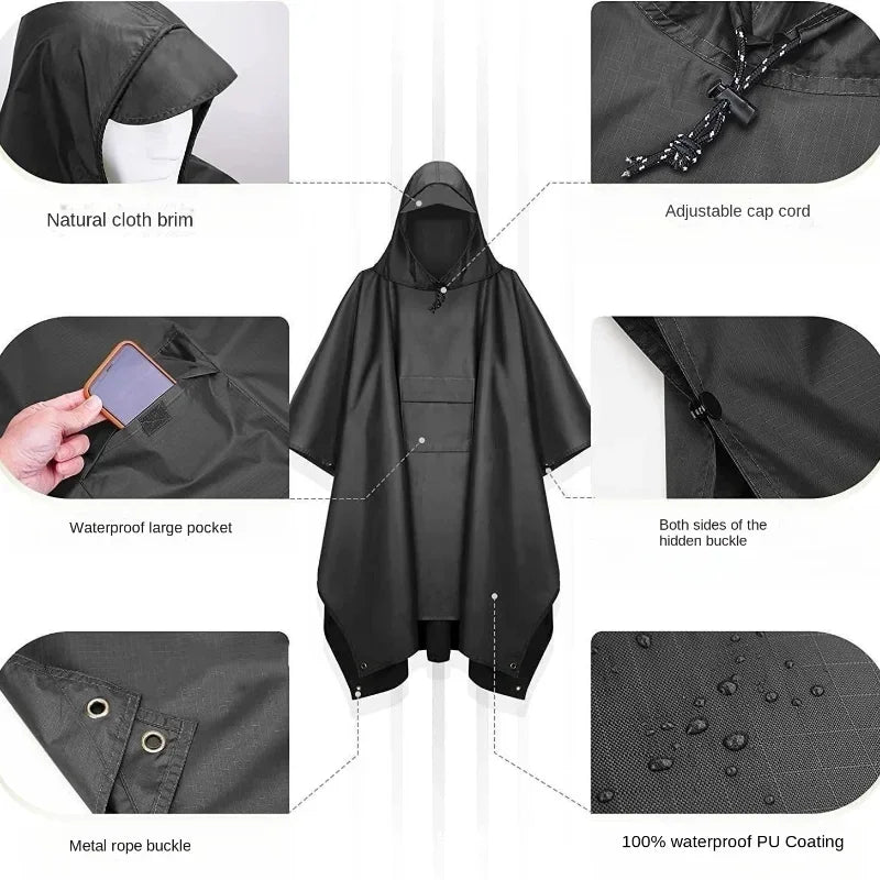Deze regenjas biedt uitstekende bescherming tegen regen tijdens al je buitenavonturen. Met een ruime capuchon en lange mouwen blijf je droog, ongeacht het weer. De jas is perfect voor verschillende activiteiten zoals kamperen, wandelen en motorrijden, en kan zelfs worden gebruikt als noodschuilplaats.