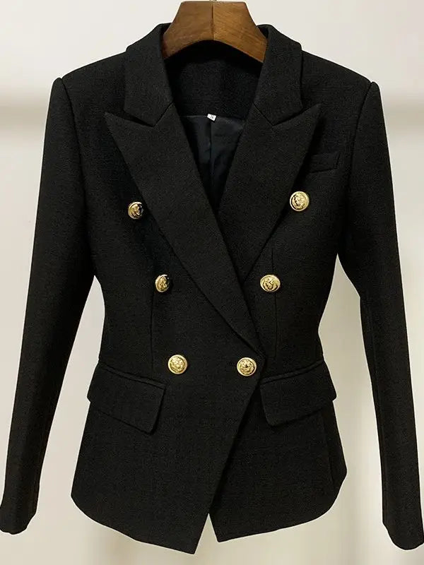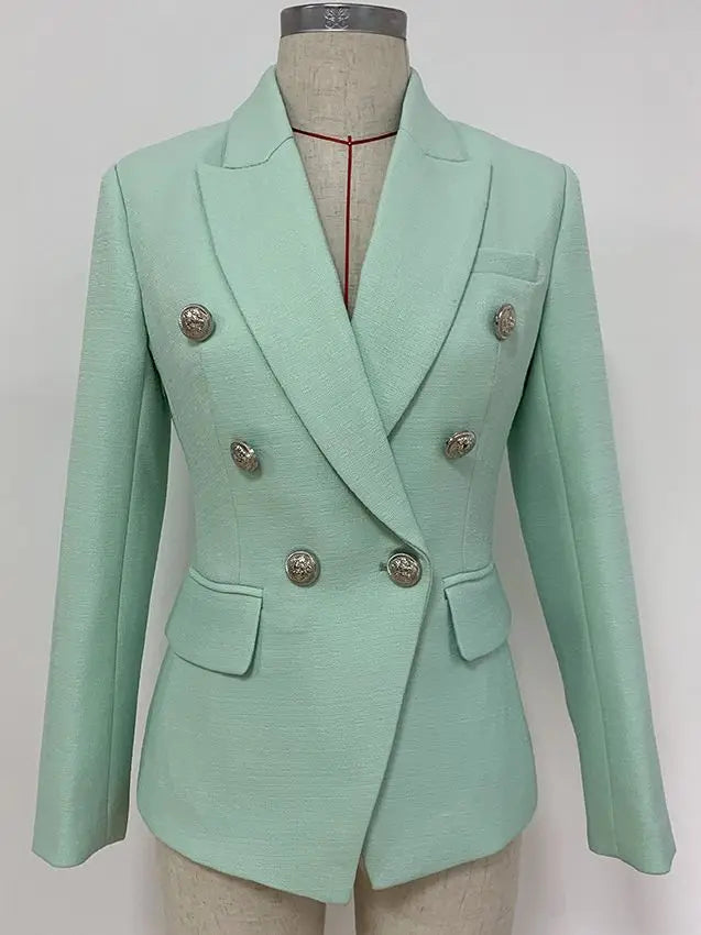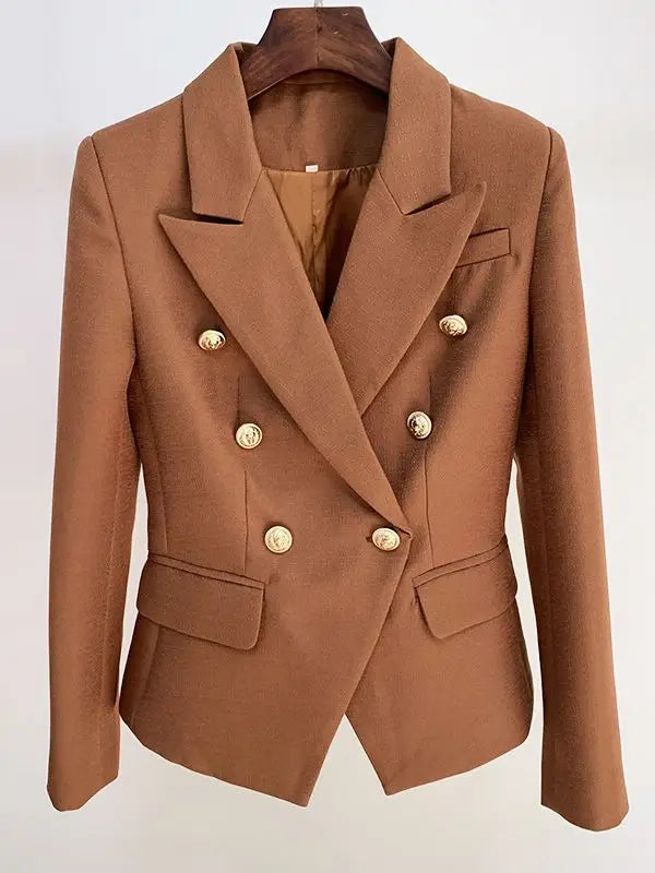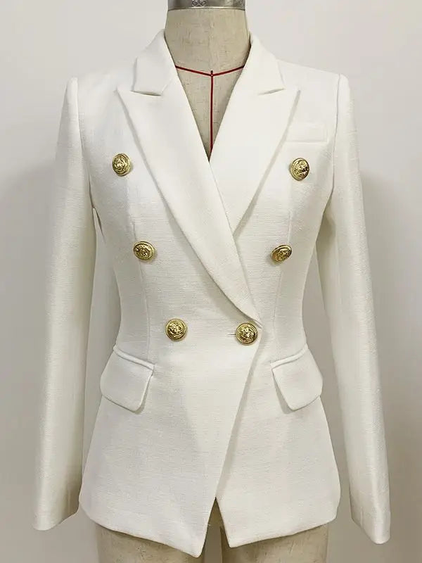 Til je stijl naar een hoger niveau met deze tijdloze blazer. Het dubbele rij knopen en de slanke pasvorm zorgen voor een elegante en verfijnde look, ideaal voor zowel formele als casual gelegenheden. De subtiele textuur geeft een unieke touch aan dit klassieke kledingstuk, terwijl de opvallende knopen in leeuwenmotief een vleugje luxe toevoegen. Een must-have in de garderobe van elke stijlvolle vrouw.
